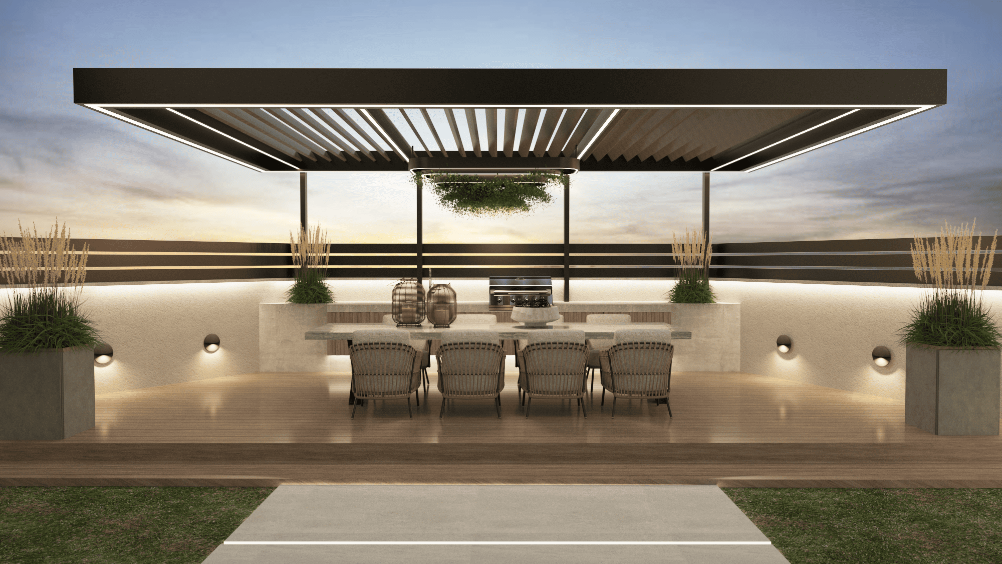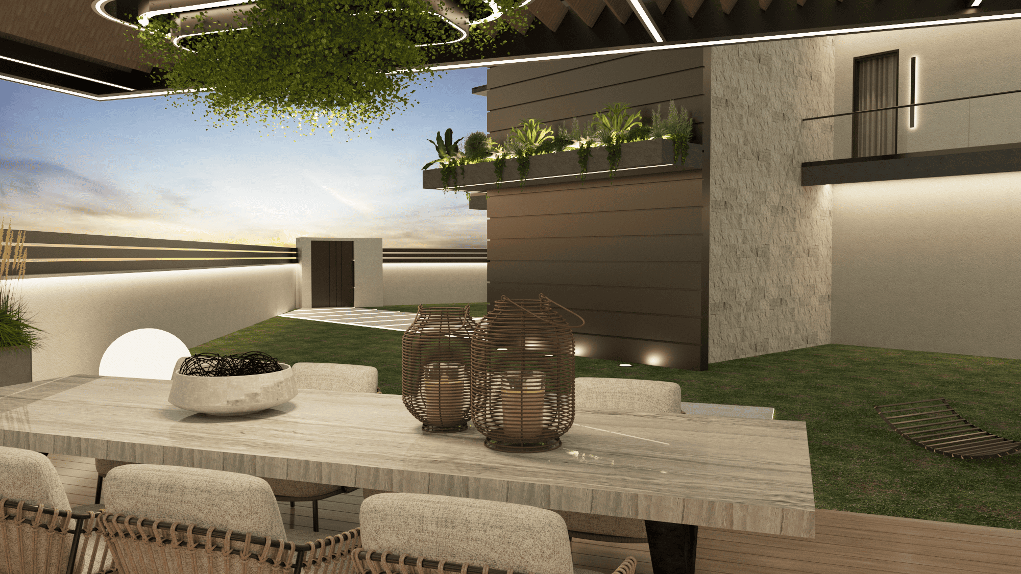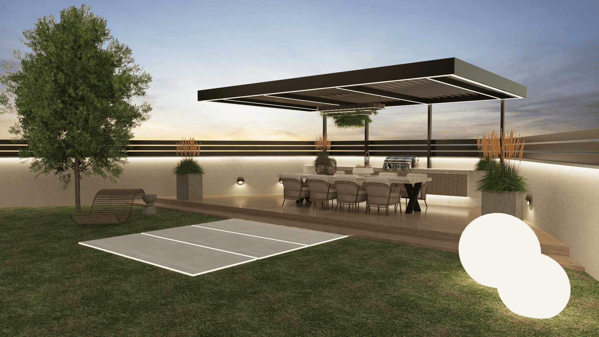 Ο εξωτερικός χώρος – σημείο αναφοράς του project – φιλοξενεί μία σύγχρονη κατασκευή μπάρμπεκιου, εναρμονισμένη με τον υπόλοιπο σχεδιασμό. Η χρήση μοντέρνας πέτρας και μεταλλικών στοιχείων δημιουργεί μια αίσθηση στιβαρότητας, ενώ παράλληλα προσδίδει μοντέρνο χαρακτήρα. Οι υφές και τα υλικά επιλέχθηκαν προσεκτικά, ώστε να αντέχουν στον χρόνο και να “δένονται” με το φυσικό περιβάλλον.